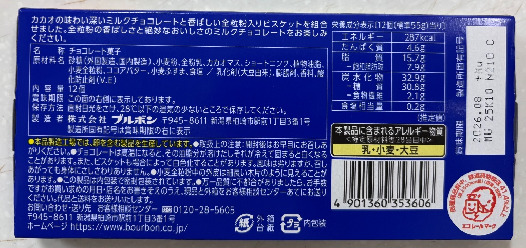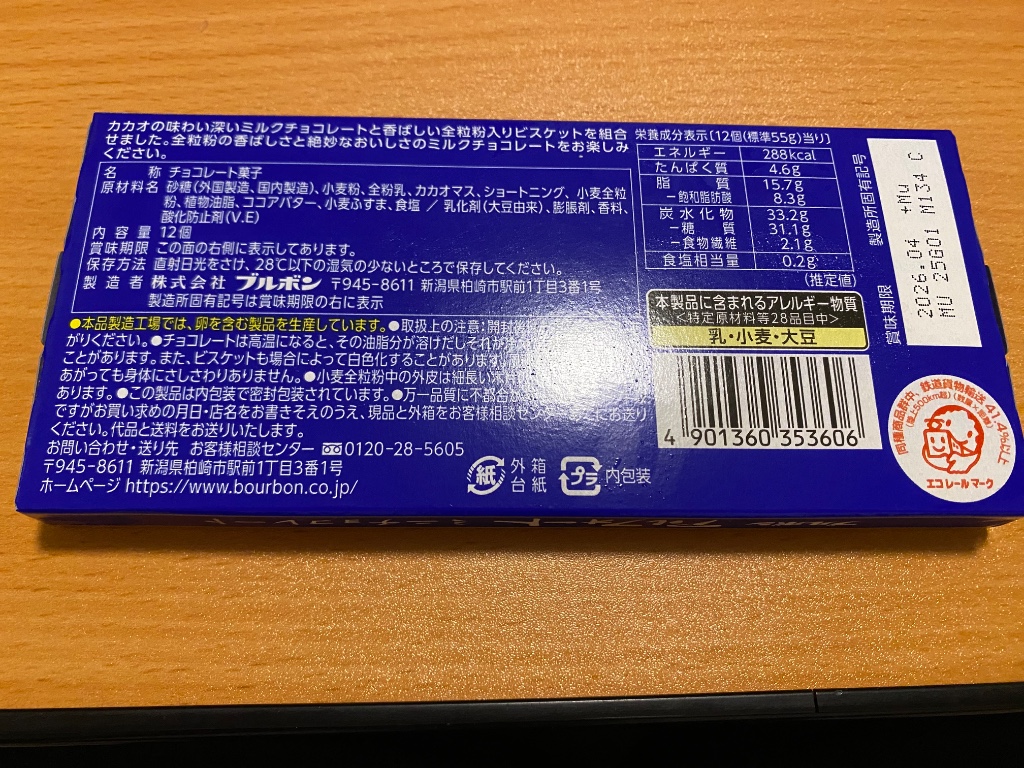 ミルクチョコと全粒粉入りビスケットの相性がいいですね。通常サイズのものより、ミニサイズのこちらのほうが手軽で食べやすいです。