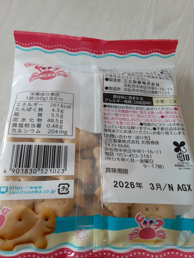 スーパーのかけるお菓子のコーナーにかかっている昔からあるかにビス。子供の時からある定番のかにビス、懐かしい気持でいっぱいになりました。でもパッケージに書かれているビフィズスとカルシウム入りがとても目新しくッて今の時代に合った健康志向子供にも食べてほしいビスケットに進化しているのにも驚きました。コブクロサイズでパッケージの絵柄もそうですが、てでつまんで口にいれるとおさまりの良い小さなサイズ、かわいい形にニッコリと癒される気持ちになれます。もち運びにも便利だし、小さなお友達への気軽なプレゼントにも最適です。... 続きを読む