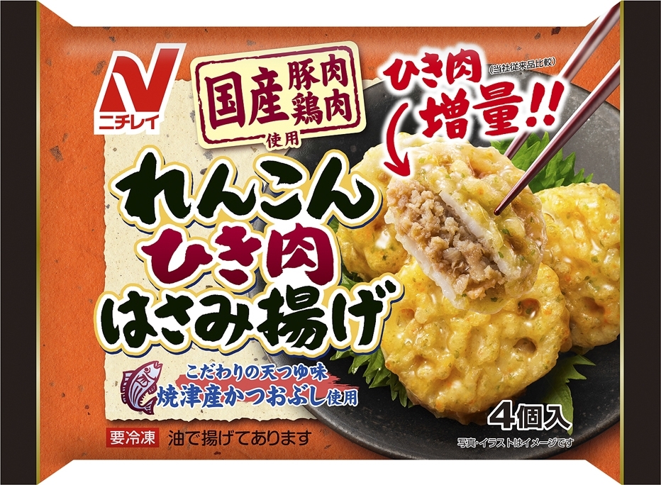 「鶏・豚のひき肉を歯ごたえのよいれんこんで挟んで揚げた人気のメニューです。食感の良い衣に国産の「アオサ」を加え、かつおぶしの風味豊かな天つゆで仕上げています。ひき肉を増量し、食べごたえがアップしました。タレを改良しさらに香り豊かに仕上げました。」