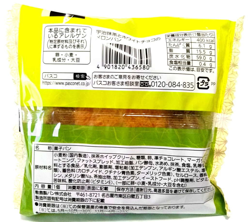 | 原材料表示 | 小麦粉、糖類、抹茶ホイップクリーム、卵、準チョコレート、マーガリン、ショートニング、ファットスプレッド、加工油脂、パン酵母、水あめ、抹茶、食塩/乳化剤、膨脹剤、増粘剤(加工デンプン、アルギン酸エステル、増粘多糖類)、着色料(カロチノイド、クチナシ青色素、ターメリック色素)、香料、セルロース、加工デンプン、グリシン、メタリン酸Na、イーストフード、茶抽出物、pH調整剤、酸化防止剤(ビタミンE)、ビタミンC、苦味料、(一部に卵・小麦・乳成分・大豆を含む) |