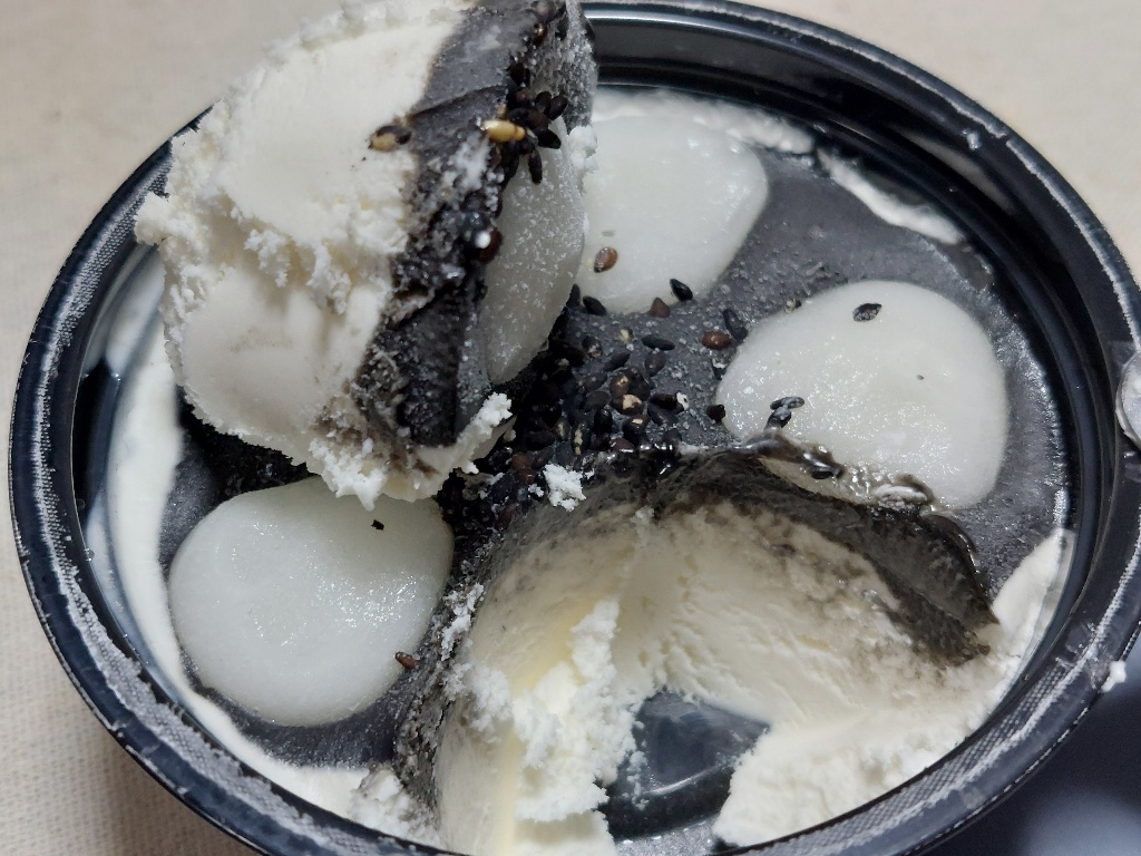 アイスはラクト感強いふわふわ系バニラに白ごま入ってるみたいやけどやっぱ分からんくらい..でも普通のバニラアイスと比べると風味が違うのでやっぱ入ってるんやろなって感じ。