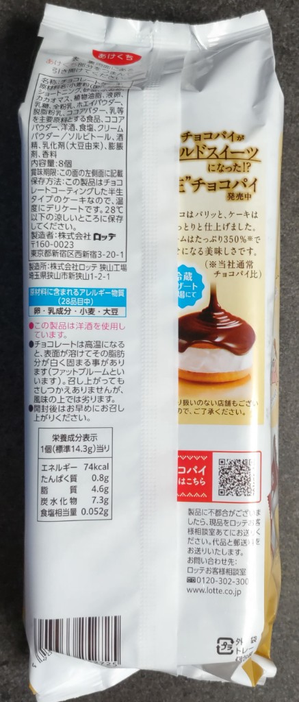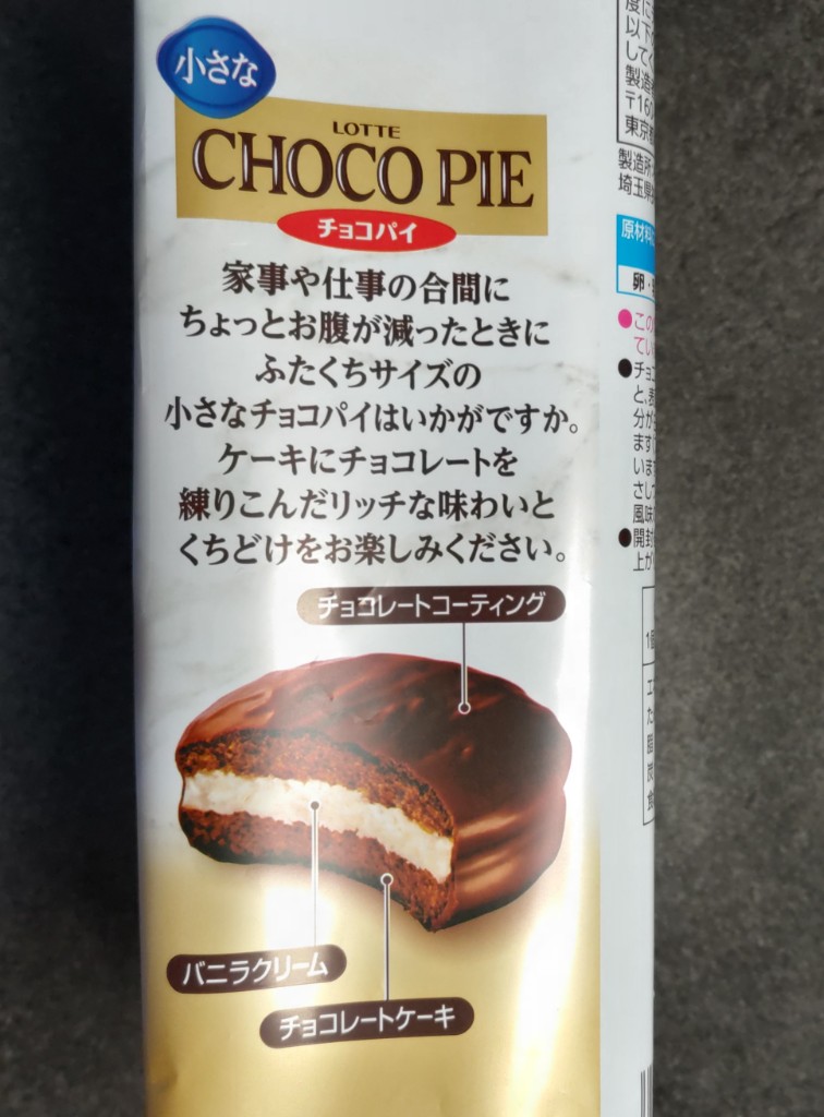 大きいチョコパイと全く同じ材料かと思いましたが多少ですが違うんですね。食べてもいまいち違いが分からない。どっちも美味しいです。... 続きを読む