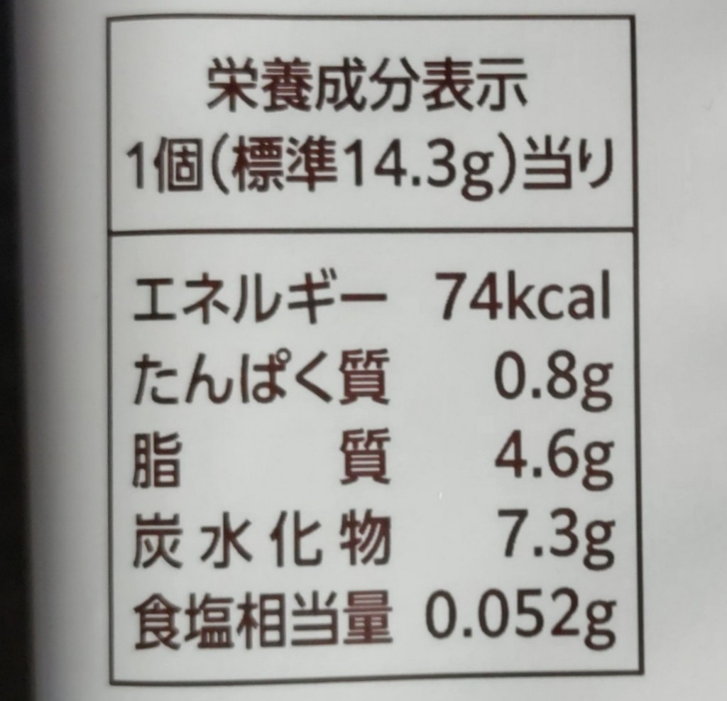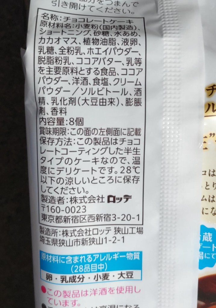 | 原材料表示 | 小麦粉、ショートニング、砂糖、水あめ、カカオマス、植物油脂、乳糖、全卵、全粉乳、脱脂粉乳、ココアバター、ホエイパウダー、乳等を主要原料とする食品、ココアパウダー、洋酒、食塩/ソルビトール、酒精、乳化剤(大豆由来)、膨脹剤、香料、加工でん粉 |