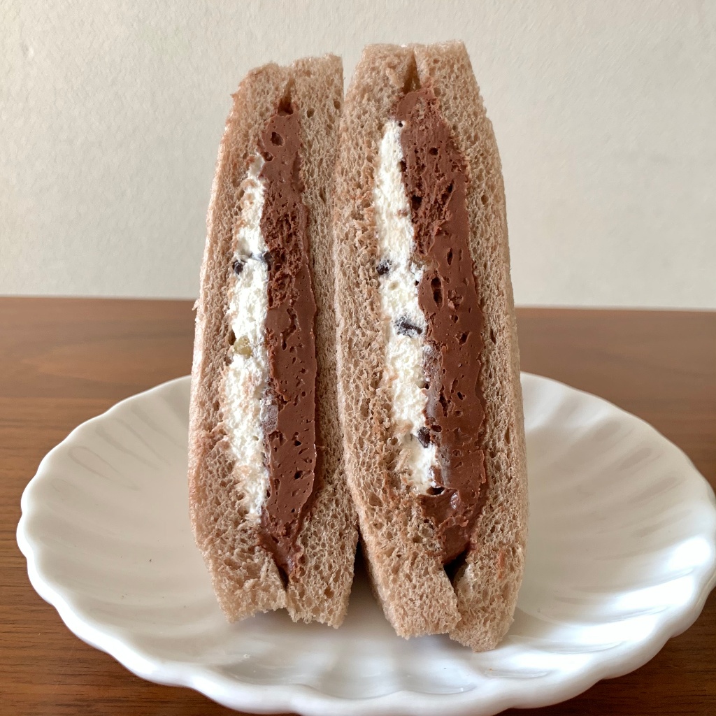 中身が引き立つ感じで。これが普通の甘いチョコスポンジだと、途端にクドいチョコケーキに終わるところ(勝手な偏見^^;)が、甘さの無いしっとり柔らかいパン生地が、良い具合に逃し場になっていましたね。持った感じに違わず、ラムっぽい風味がする濃い味のクリーム2種が隅々までたっぷり入っておりました。ヘーゼルナッツ味(と感じた)のチョコクリーム&やや黄色帯びて甘さ強め?なホイップクリーム。人によってはこのスイーツサンド形態でも三角1個(半分)で満足かも。ナッツとチョコチップが断面中央エリアにコリコリと、ほぼ食感に徹してアクセントになっていました。何故ならば、クリームの味がかなり濃いから。儚さ(食べ応えの弱さ)は微塵も感じないスイーツサンドでした。