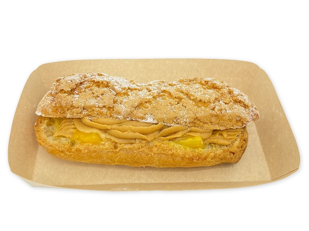 「歯切れの良いエクレア皮に、甘酸っぱいマンゴーの果肉とソース、ほろ苦いキャラメルクリームを詰めました。」