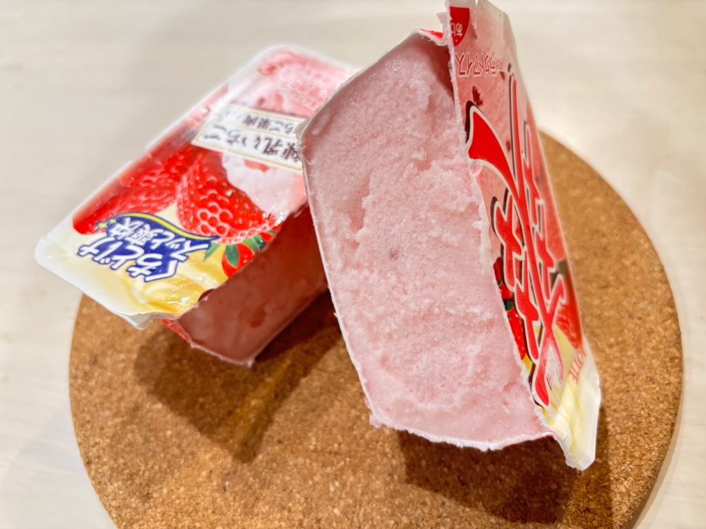 少しシャリっとしたアイスにいちごミルクの味が美味しい🎶なんか懐かしい🎶