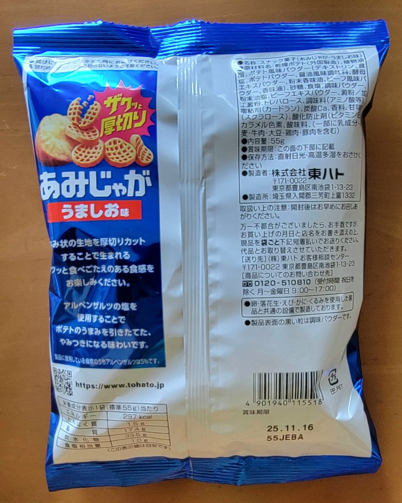 | 原材料表示 | 乾燥ポテト(遺伝子組換えでない)、植物油脂、食塩(アルペンザルツ3%)、砂糖、粉末油脂、ブドウ糖、牛脂加工パウダー、ポークエキスパウダー、粉末醤油、香辛料、たんぱく加水分解物、酵母エキスパウダー、調味エキスパウダー、デキストリン/加工澱粉、トレハロース、調味料(アミノ酸等)、増粘剤(カードラン)、炭酸Ca、香料、甘味料(スクラロース)、酸化防止剤(ビタミンE)、(一部に乳成分・小麦・ごま・大豆・豚肉を含む) |