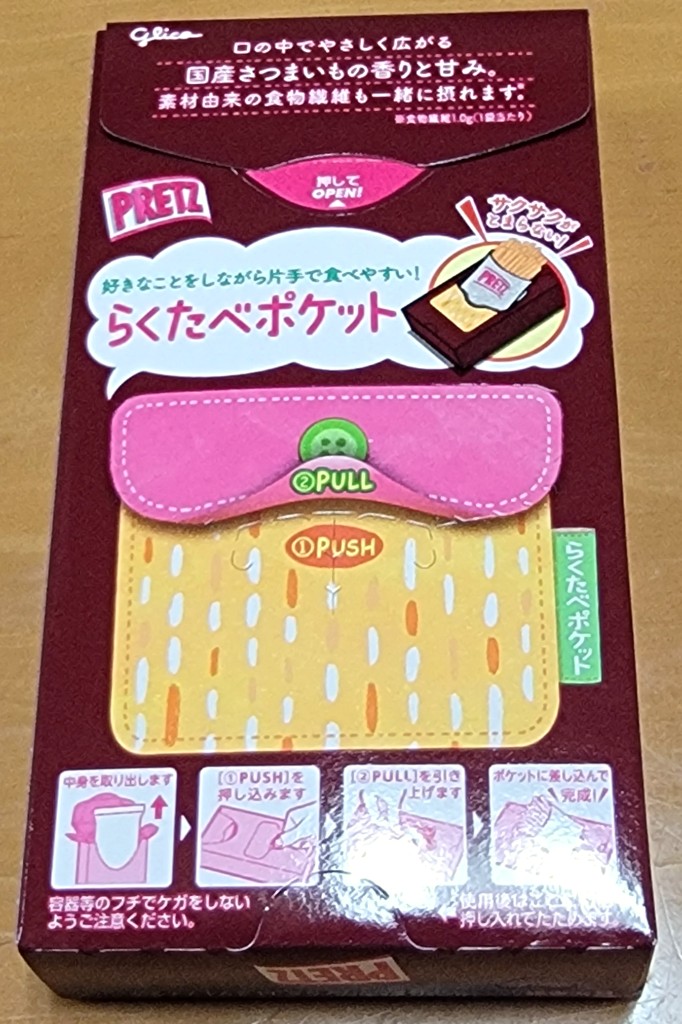 薩摩芋カラーの赤紫色の箱に入ったお菓子で、プリッツシリーズ共通で個包装2個パック入りでした。