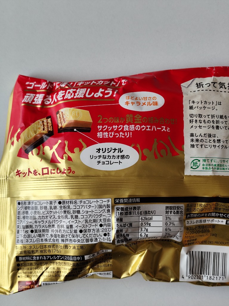 勝利や栄光の象徴であるゴールドカラーを表現した「キャラメル味」と、「キットカット オリジナル」のチョコレートの2つの味を1枚で楽しむことができます。