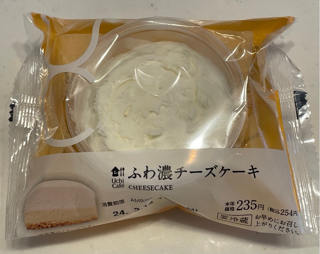 ローソンのオリジナルスイーツUchi Cafe’シリーズから2024年3月11日に発売開始された「ふわ濃チーズケーキ」の紹介です。翌日12日には「むぎゅ濃チーズケーキ」も発売されましたが、口コミ評価の高かったこちらを購入してみました。