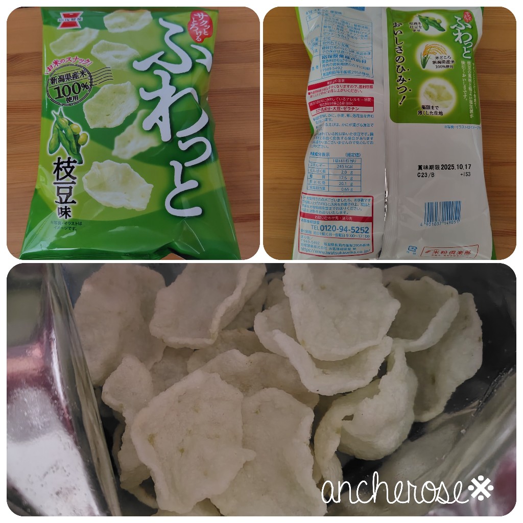 名前のとおりふわっと香る枝豆。サクサクふわっとな食感。まさにふわっと☺️濃い味じゃ無いけど、満足感のある軽いおせんべい。不思議😄