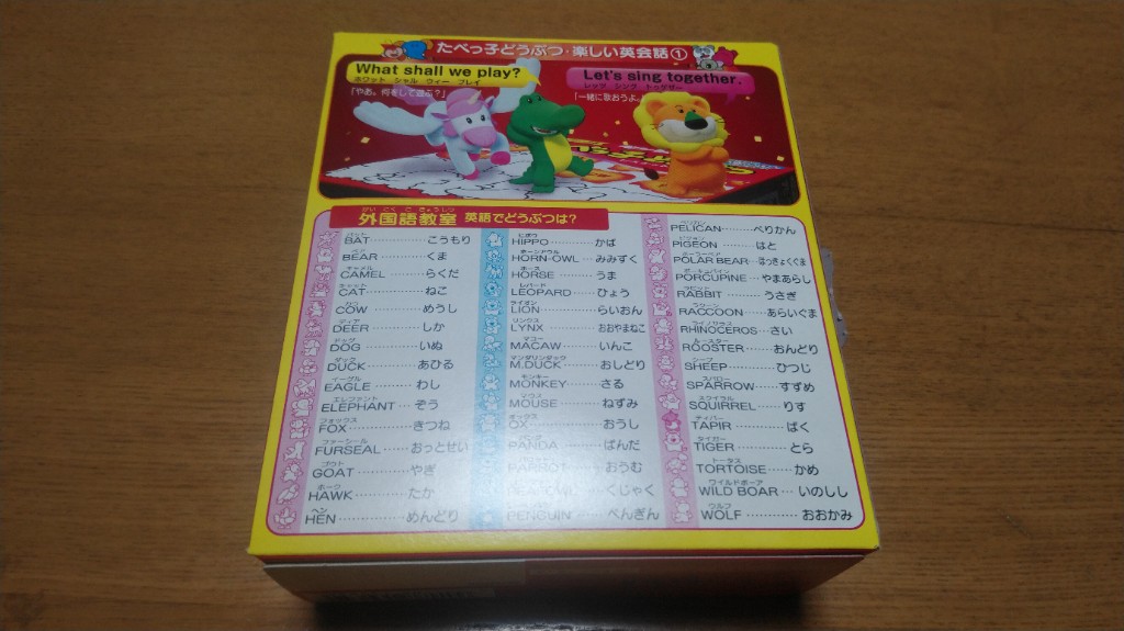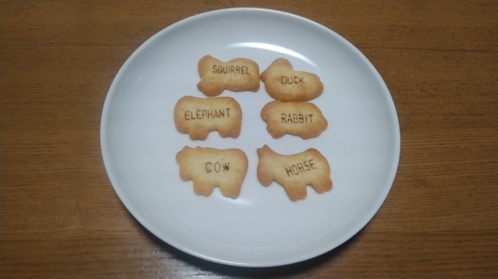 ビスケットに書いてある英語の動物名を読んで、裏箱の「外国語教室 英語でどうぶつは?」を見ながら、「この動物は、英語でこういうのか」と知るのも楽しかったです。