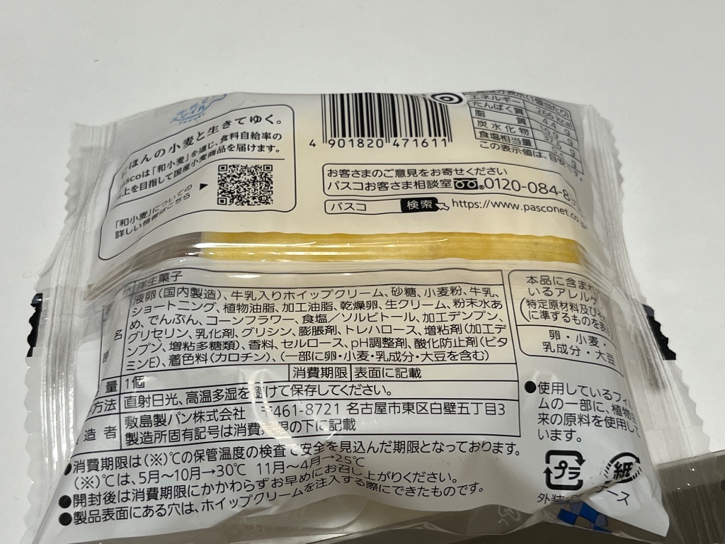 パスコの今月の新商品でしょうか?店頭で見かけて購入しました。安心の国産小麦シリーズ以前も頂き美味しかったので。少し冷凍庫で冷やしてから頂きました。冷たく冷えたスフレ生地はふわふわしっとりキメ細かくて 卵風味もしっかり。中に注入されたホイップクリームは常温タイプですが ミルク感しっかりでふわっとコクあり。サイズ感は小さいですが、満足のお味で、今回もなかなか美味しく頂きました。また購入します。... 続きを読む