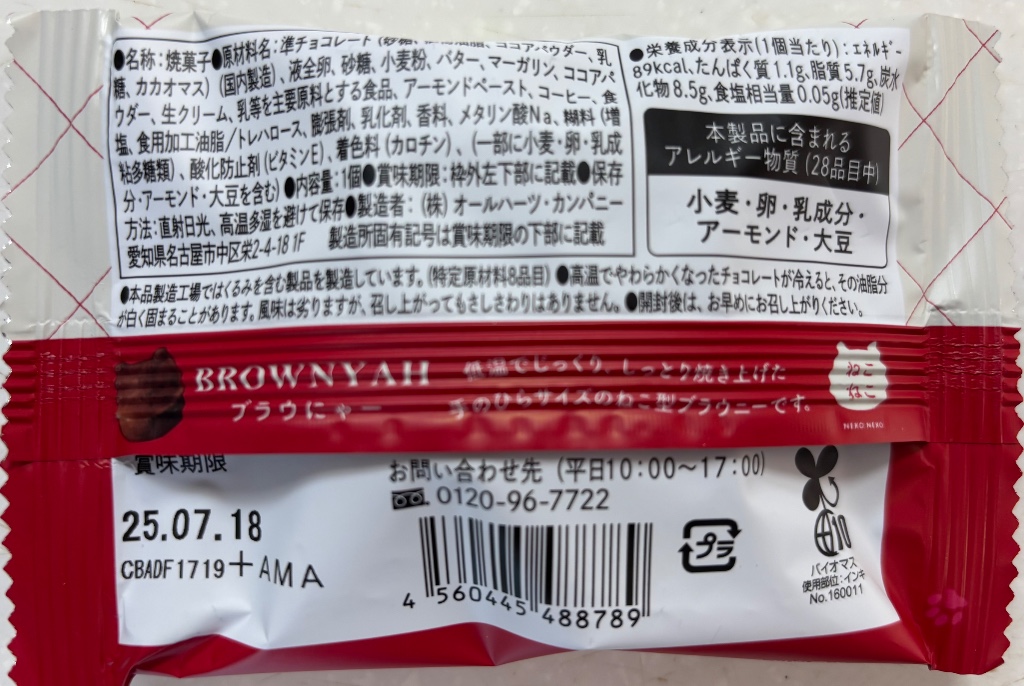 オールハーツ・カンパニー ねこねこ ブラウにゃー チョコ。気になっていたこの商品。半額になっていたので、購入しました。 期間限定で登場し、過去に累計販売12万個※1を突破した、「黒ねこ」に見立てた可愛い手のひらサイズのねこ型ブラウニーです。 バターと北海道産の生クリームを使用し、まろやかなチョコの味わいをお楽しみいただけるよう仕上げました。 通常のブラウニーより低温で焼くことで、よりしっとりとした食感に。 隠し味にしのばせたコーヒーとナッツペーストがコクの深みを引き出します。... 続きを読む