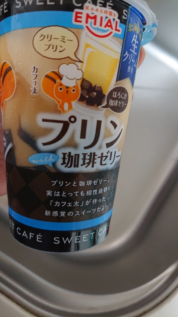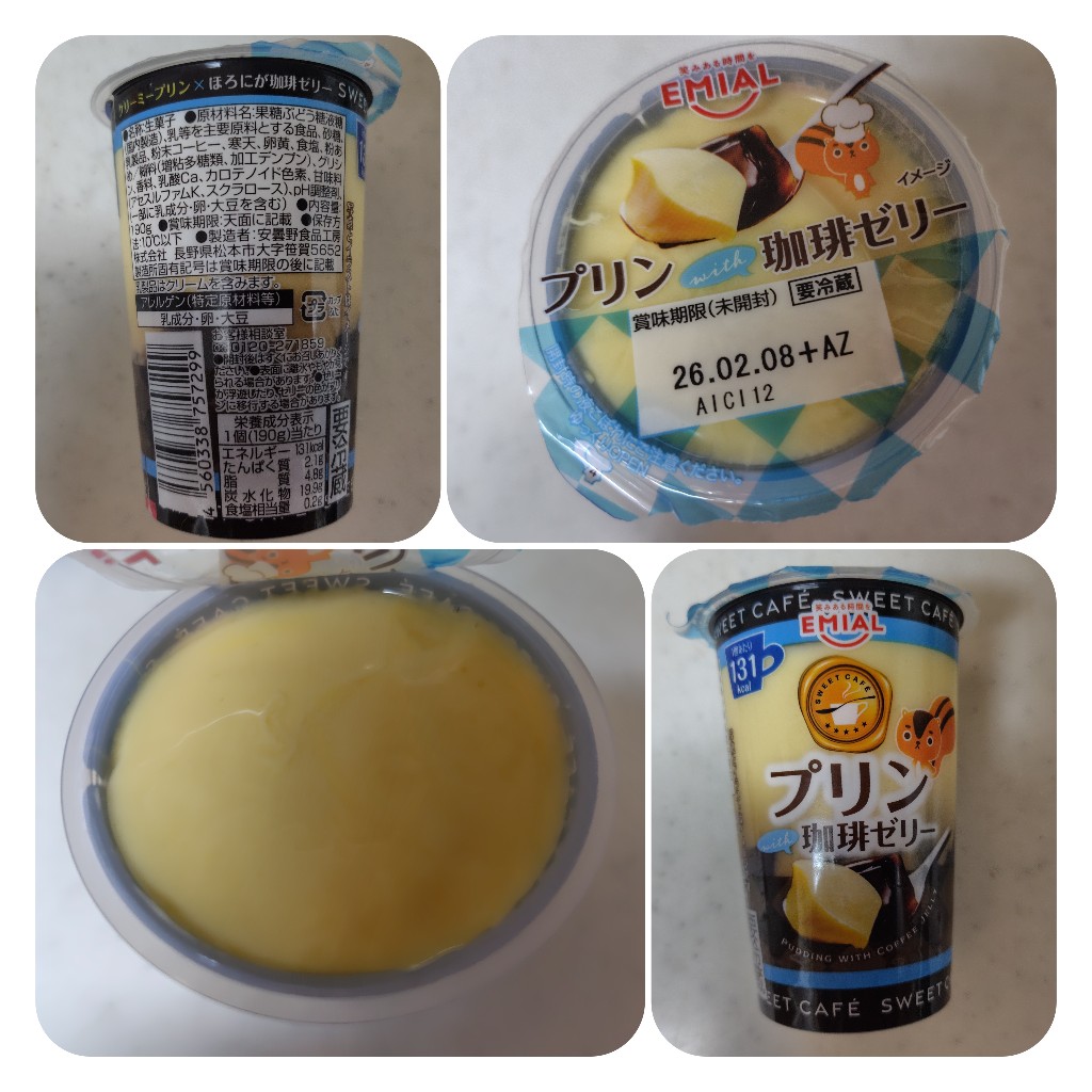 プリンwith珈琲ゼリー。職場でいただき、主人と食べるのに追加購入。主人には、プリンなん?ゼリーなん?と、問われましたが、答えは両方さ、というスイーツでした。珈琲味のプリンなんかな?と思いましたが、上から普通に食べ進めるとプリンのち珈琲ゼリーです。長めのスプーンで混ぜて食べることも可能ですが、今日は両方食べたいんやっ!な日にはちょうどよいです。容器の上から半分くらいまで滑らかなプリン、下半分がひとくちサイズの甘さ控えめ珈琲ゼリーです。はじめ甘め次に苦め、なんで後味がいいかもです。サイズも190gと大きめ。珈琲ゼリーを入れた後にプリンを入れて固めたんかなー?と、製作過程をぼんやり想像しながらうまうまいただきました。おいしかったです!