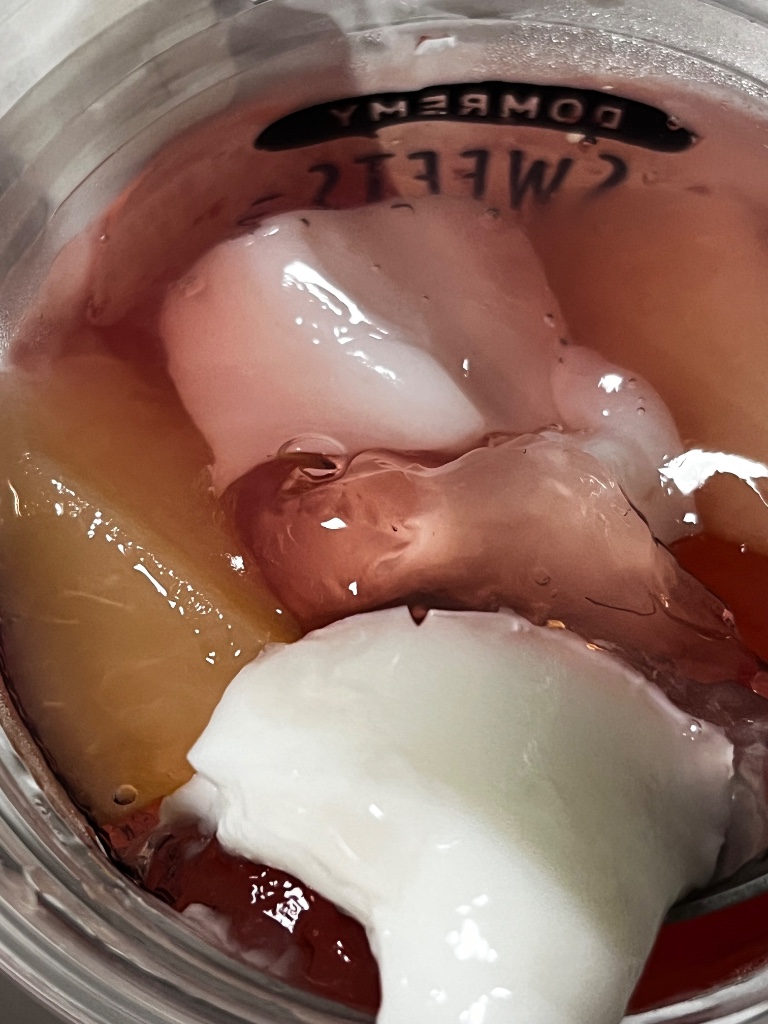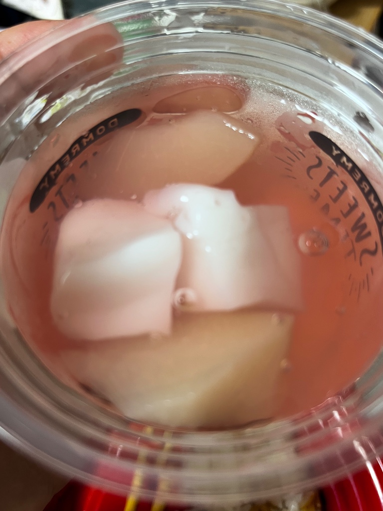 すごく美味しかったので高評価です! 本当にとろけるわって感じの杏仁豆腐で上のジェリーが微妙ここもゼリーっていうかとろける食感に合わせている感じ。桃の果肉が2切れ入ってました。 謎の杏仁?角切りのがゼリーの中に。値段も100円台と安かったと思う。