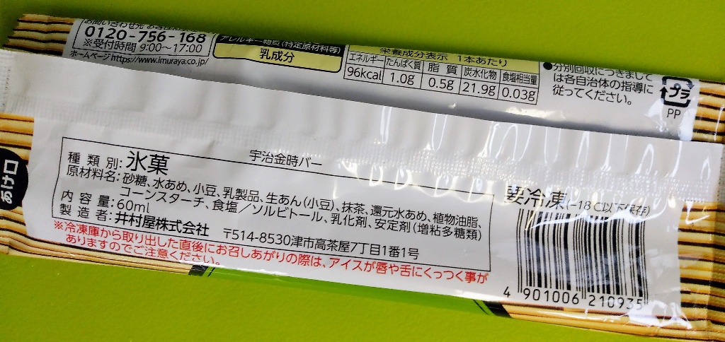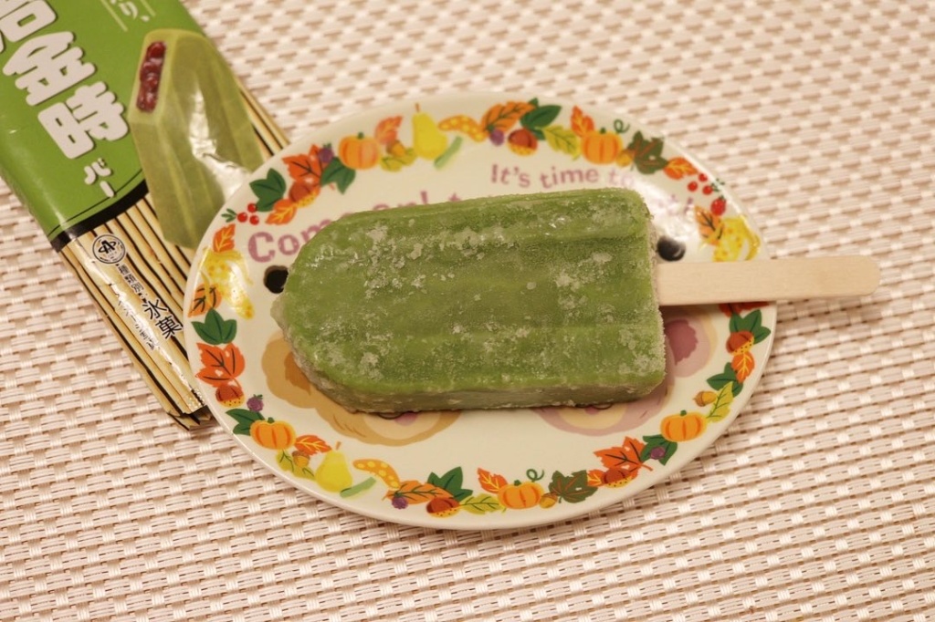 外側は硬い抹茶アイスバー、苦みはなく、あっさりしたものです。