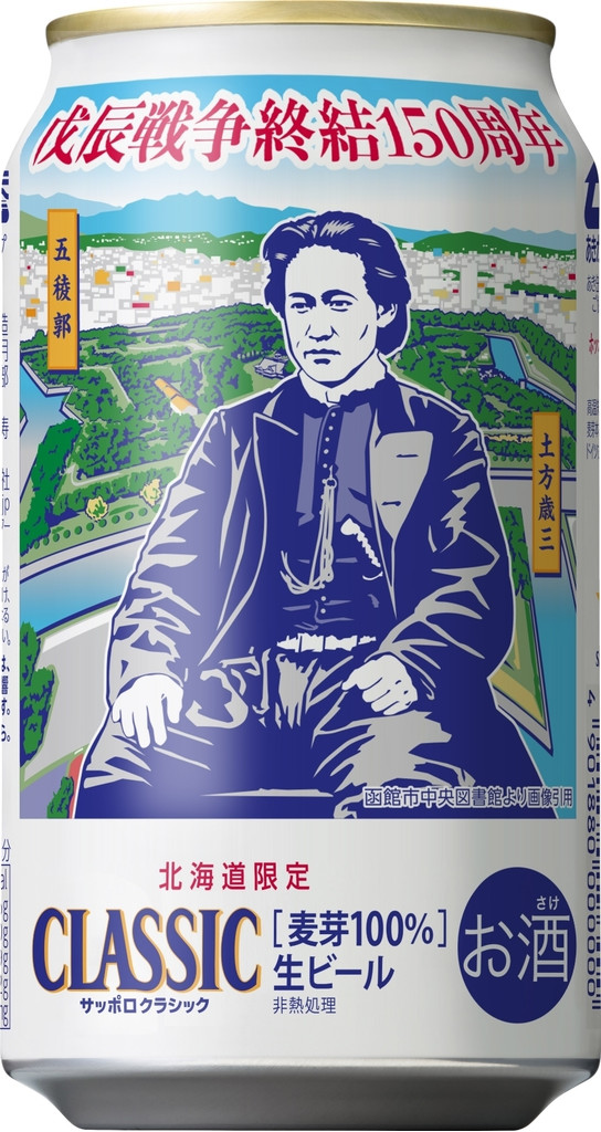 【北海道限定・数量限定】戊辰戦争終結150周年の記念缶。戊辰戦争最後の舞台となった五稜郭をバックに、函館中央図書館が所有している土方歳三の写真が載ったパッケージで、“北海道を代表する観光のまち函館”が表現されています。