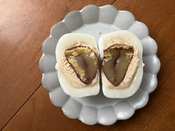 まるごとの渋皮栗をモンブランクリームとおもちで包んだ大福です。