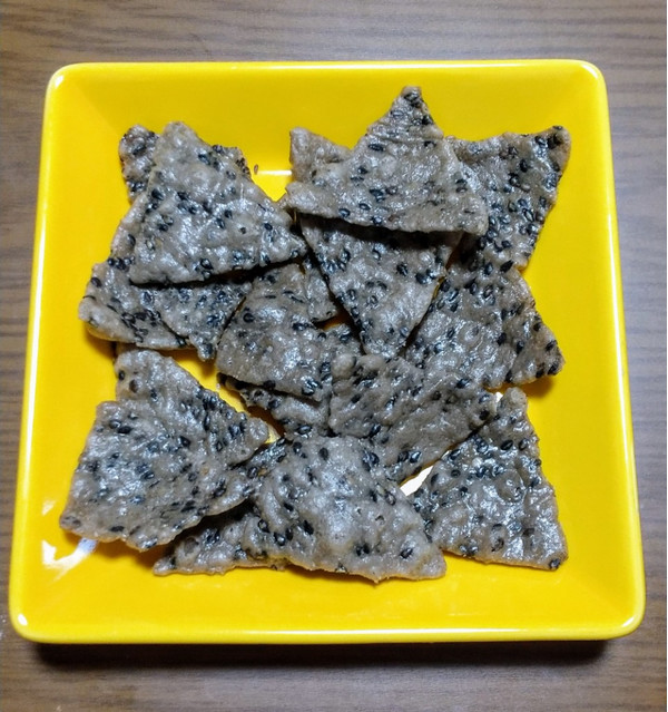黒ごまを粒ごと練り込んだお米の生地を熱風焙煎製法で焼き上げていて、まるで煎りたてのような黒ごまの香ばしさ!生地は食べやすい一口サイズでサクッとした食感が特徴で、噛むたびに黒ごまの旨みが口いっぱいに広がります。