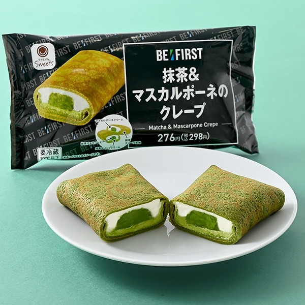 ファミリーマートのクリスマスアンバサダー「BE:FIRST」とのコラボスイーツ。抹茶のクレープ生地で、抹茶ホイップクリームとマスカルポーネクリームを包んだクレープで、中に、抹茶チョコソースが入って、抹茶感をしっかりと楽しめる一品です。