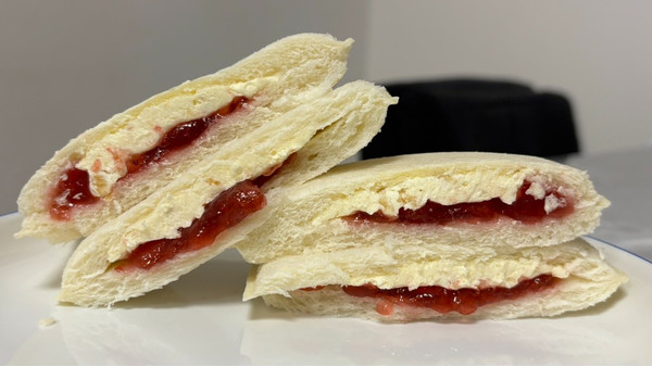 果肉感のある苺ジャムとザクザクとした食感のクッキー入りクリームをサンド。