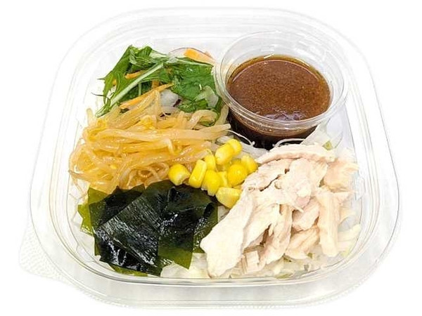 桜島どりを使用した蒸し鶏と彩りの良い野菜を盛り付け、ピリ辛ドレッシングで食べるラーメンサラダです。