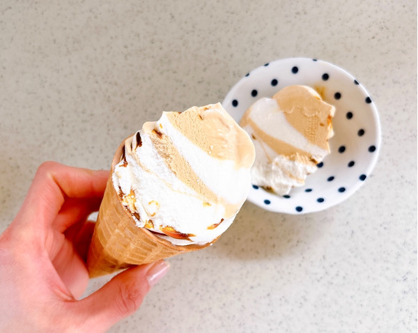香ばしいきなこアイスとコクのあるリッチミルクアイスに黒蜜ソースを巻き上げた、きなこみるく味のワッフルコーンです。