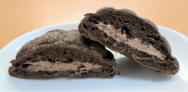 チョコ風味のメロンパンに角切りチョコと濃厚チョコホイップがサンドされています。