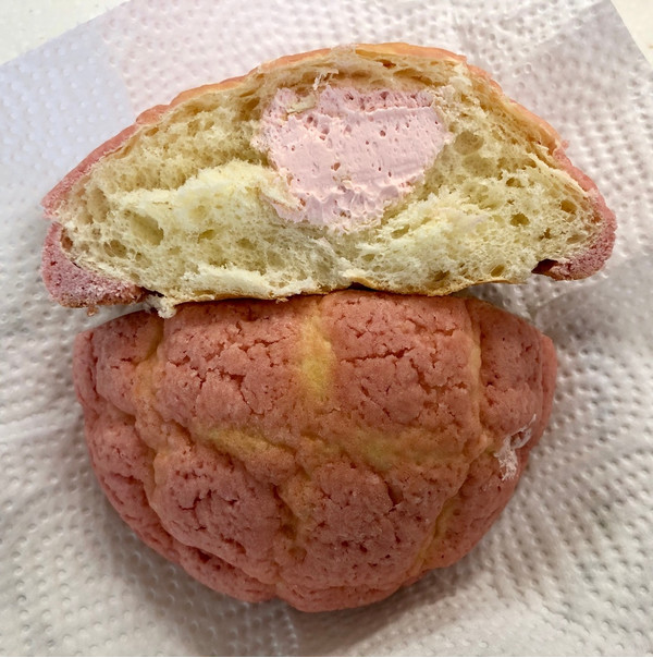 あまおう苺のビスケット生地をトッピングしたメロンパンに、あまおう苺のホイップクリーム入り。