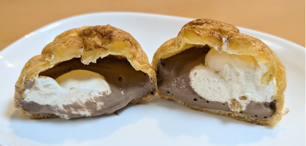 チョコとホイップのシュークリームでした チョコは甘めのチープなクリームですけどホイップとダブルなので意外と軽く食べられました 中身は詰まっていますけどシュークリーム自体が小さかったです… 続きを読む出典:スルトリンさんのクチコミ