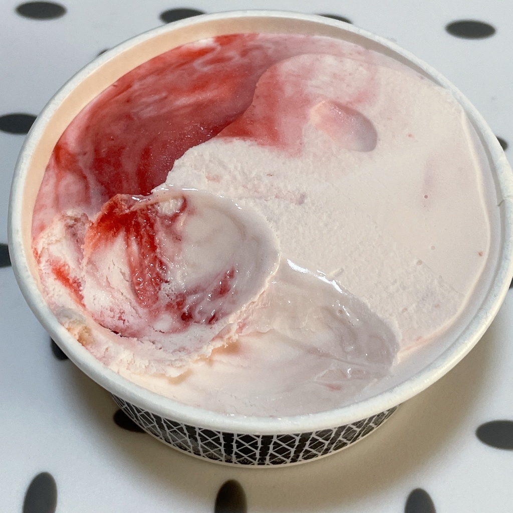 スプーンがすっと入る柔らかくて口溶けのいいアイス。見た目はかわいいピンク色。いちご果汁・果肉を10%使っているそうで、いちごソースの甘酸っぱさとミルキーでふんわり桜の味がするアイスがとてもよく合う!いちごソースは粒感も感じられて食感もよき。桜の味は強すぎないから万人受けしそう。美味しくてあっという間にぺろりでした😋🍴