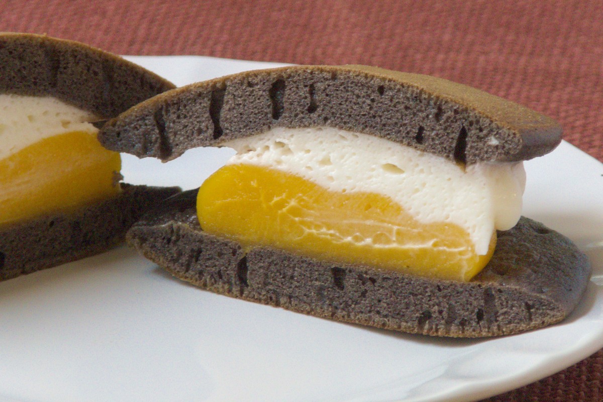 かじればしっとりホロホロ感ある、ココア風味のどら焼き生地。
