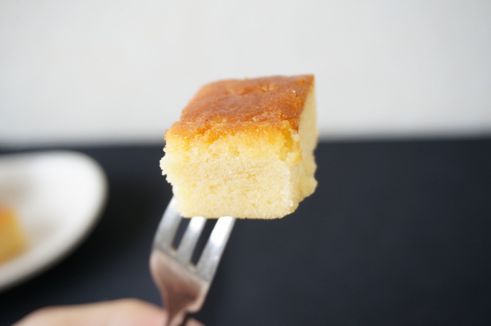 少しチーズ感のあるミルキーで甘い香ばしい匂い。生地の表面は全体がカリカサッと焼けて少し硬くなり、黒っぽく焦げたところはカリカリ感が強い。上面の高いところは砂糖の焦げた質感でよりカリカリとしている。中の生地は特に変化は無さそう。ホイップは生地から垂れたりはしない程度に溶けて緩くなり、ツヤっと光沢も出ている。