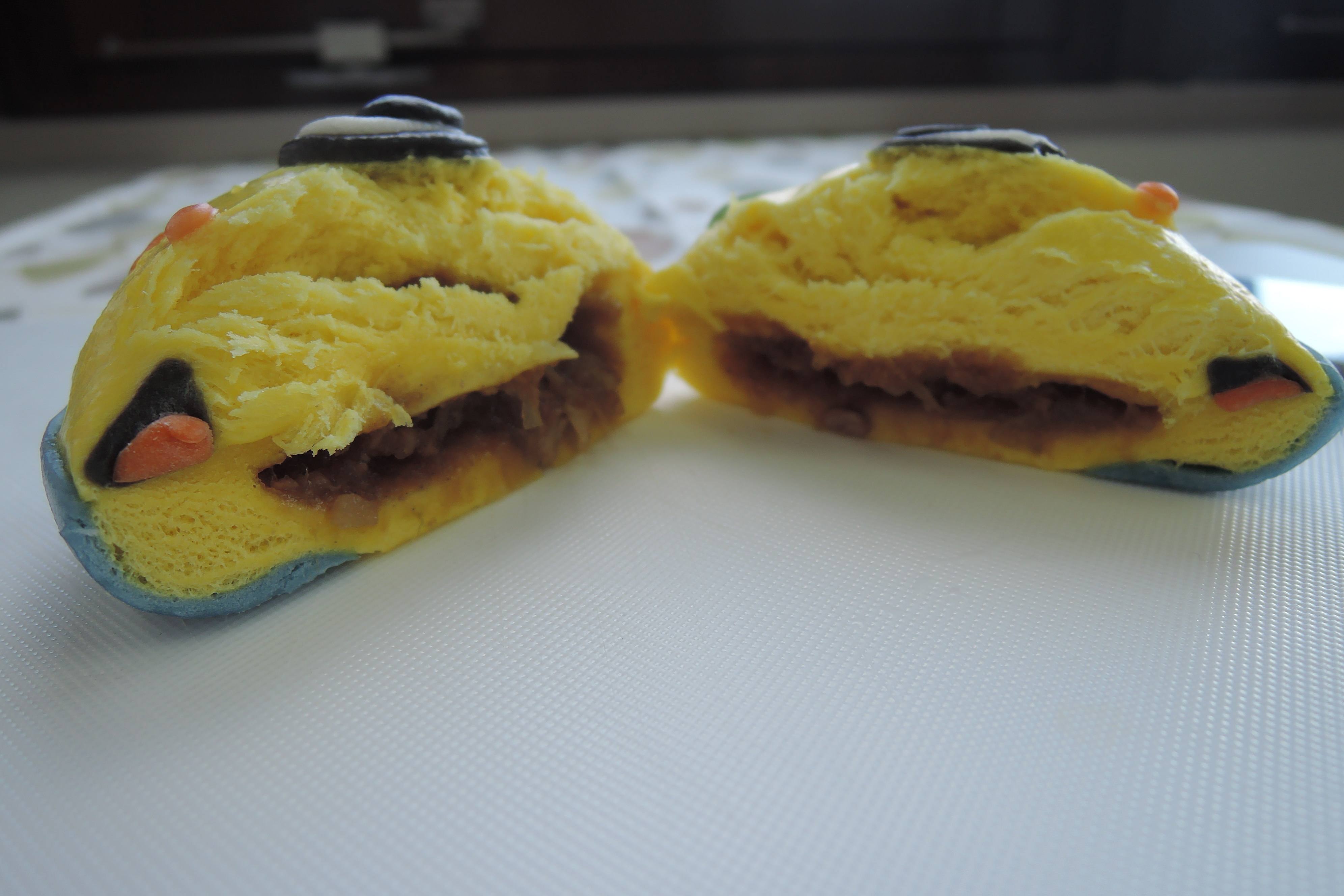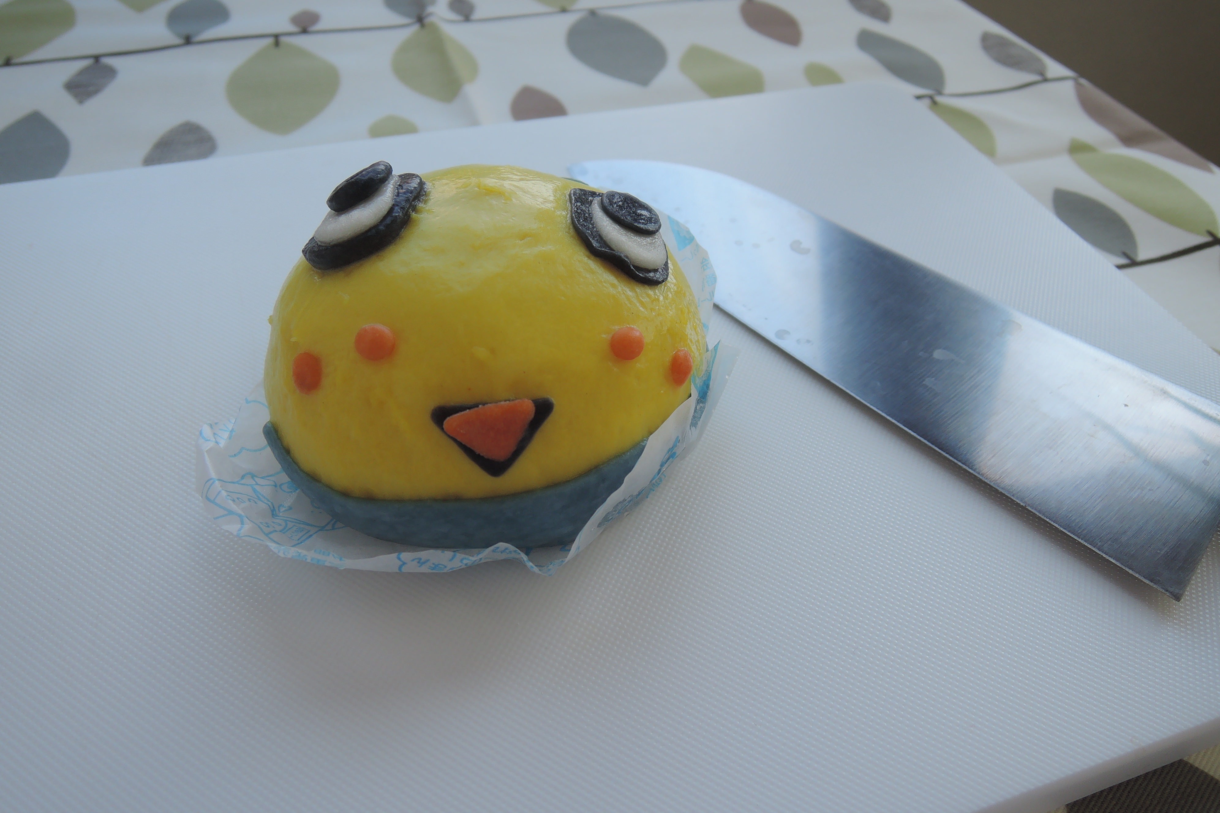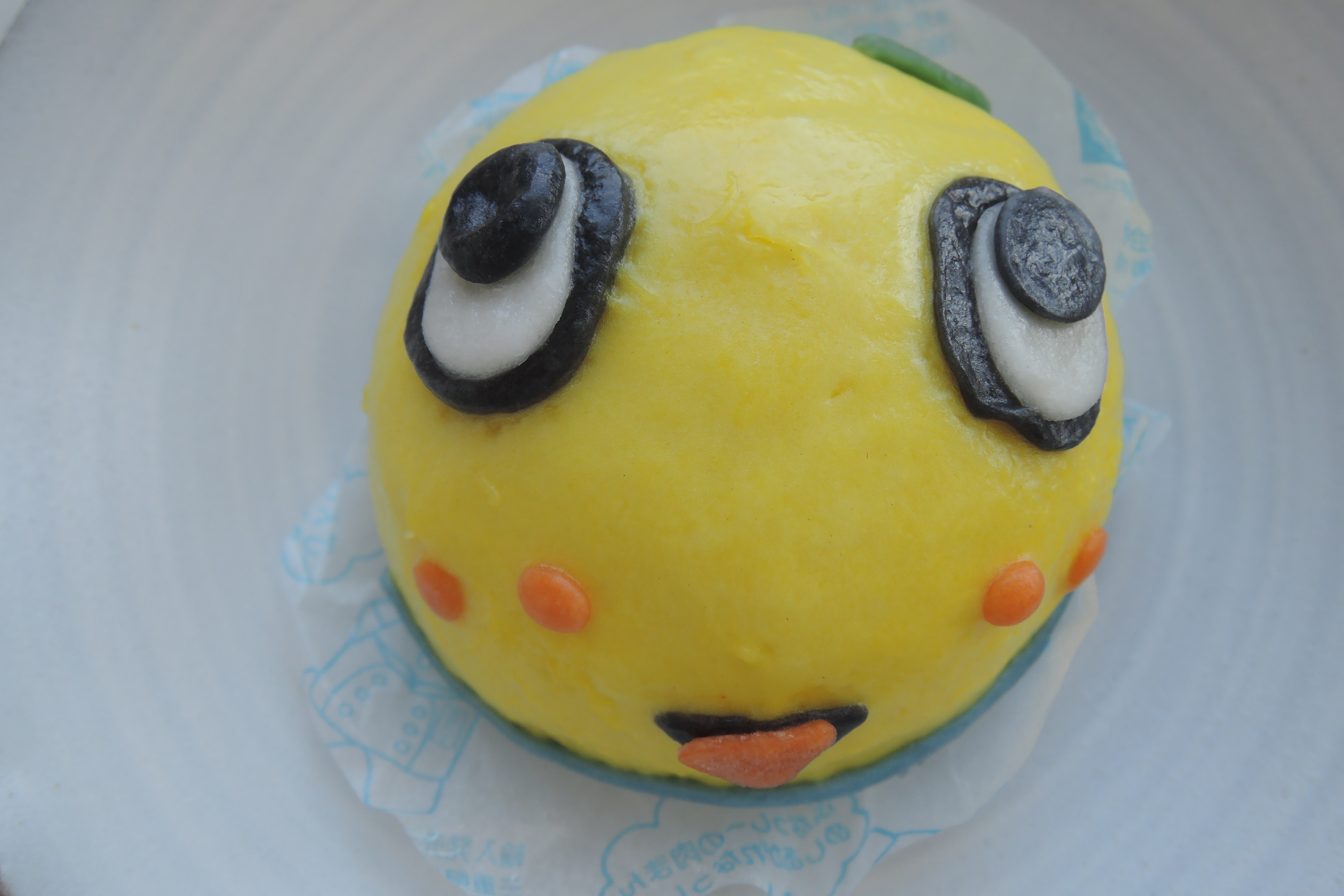 いざ開封し、お皿の上に置いて眺めてみると、ものすごい再現度である。着ぐるみを中華まんにするとこんなことになるのか。ふなっしーさんの黄色をベースに、目、口までしっかり再現されている。ファミマにはキャラまん職人でもいるのだろうか。