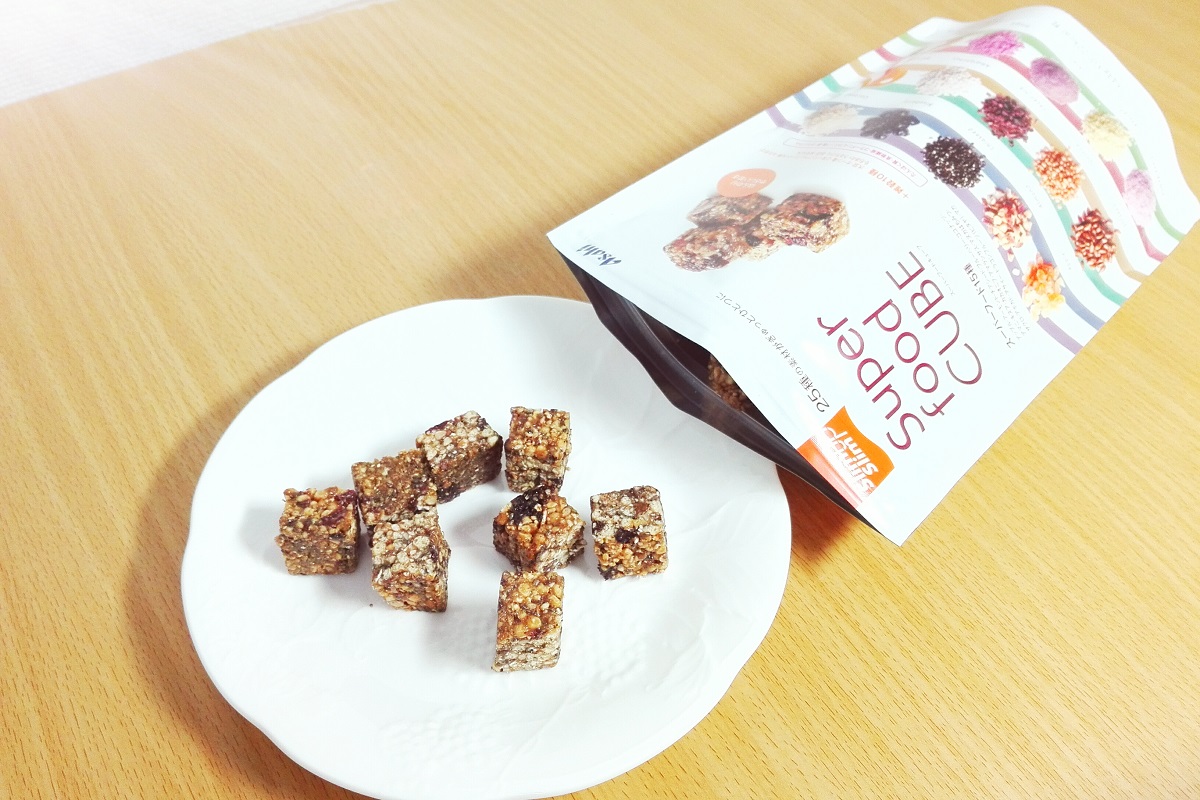 「スリムアップスリム スーパーフードキューブ」は、スーパーフード15種と雑穀10種の、計25種類の栄養が手軽にとれる一口サイズの焼菓子。