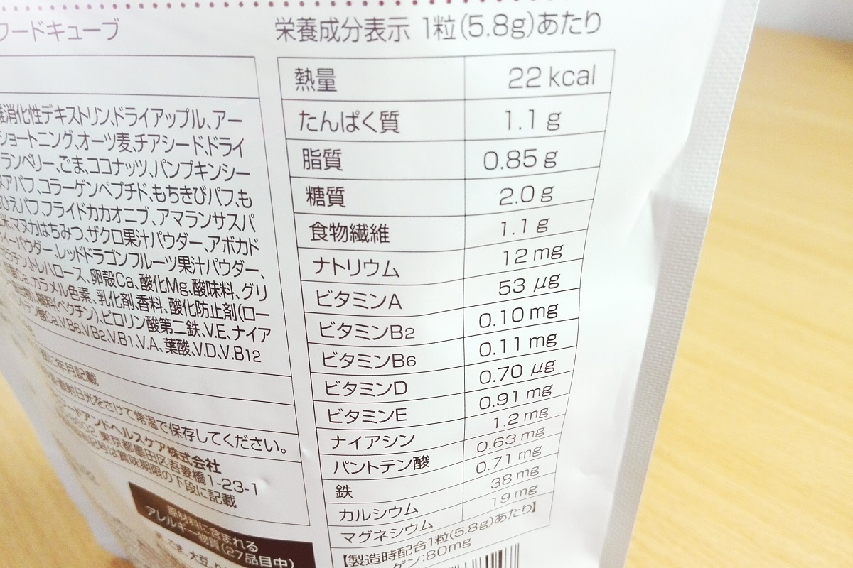 たんぱく質、食物繊維、コラーゲン、ビタミン7種、鉄、カルシウムも配合されたスペシャルなおやつなの!