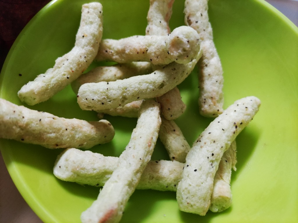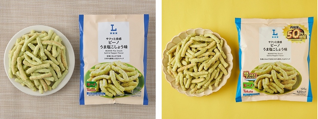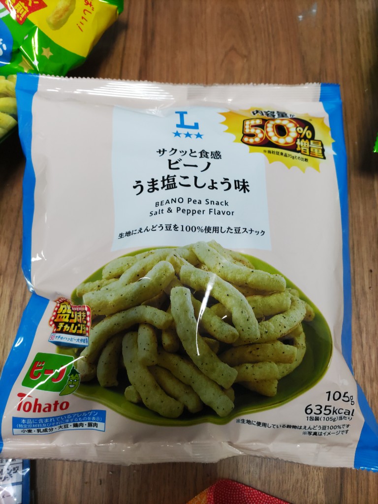 サイズが大きいフィンガータイプのパフスナックです。 柔らかめのフワッとした食感で えんどう豆の風味をメインに 塩気と胡椒の辛さがほんのり効いてて 美味しかったです^ー^ つまみ系のお菓子。