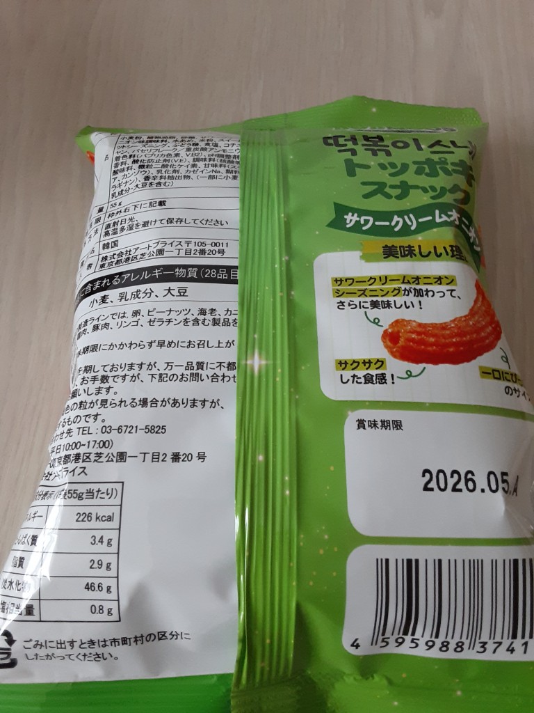 サワークリームオニオン風味の粉がかかっていて、口に入れた瞬間はサワークリームオニオン噛むとトッポギの味がしてきて美味しいです... 続きを読む