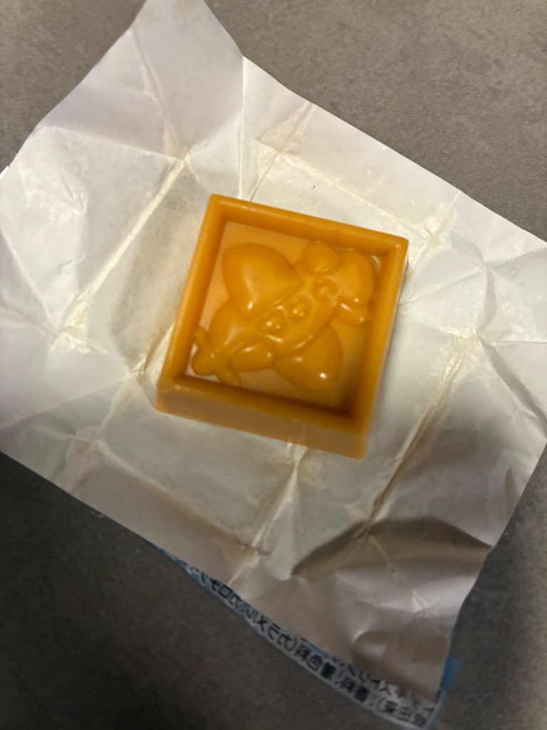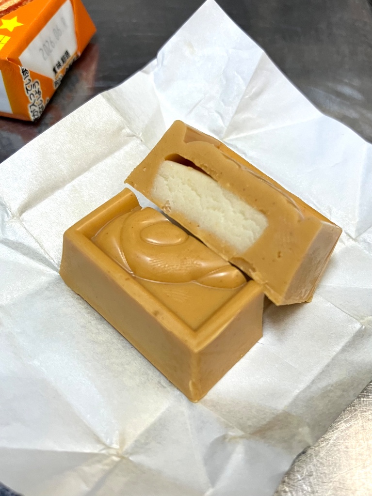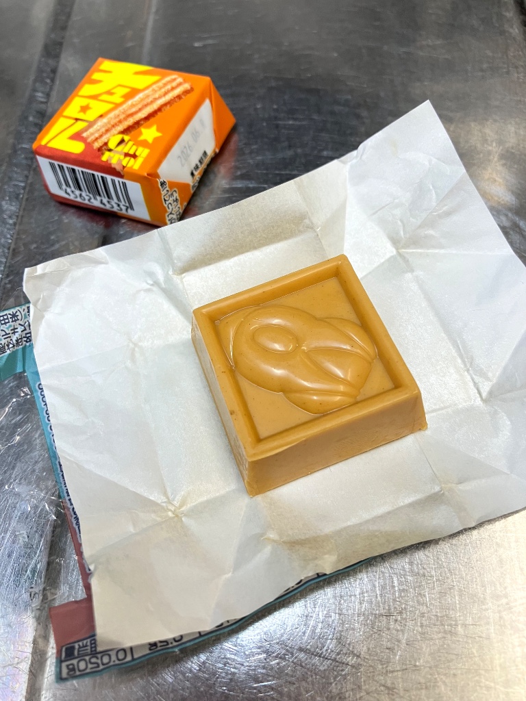 見た目はバラ売りサイズのキャラメル色?のチロルチョコ。常温からの実食だったので柔らか食感で、甘くて美味しい〜(*^^*)