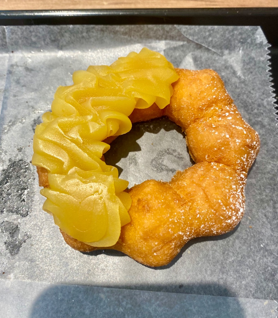 生地はオールドファッションやゴールデンチョコレートのチョコじゃない版みたいな、どっしりとした生地でポンデではないです。でもそれがまた美味しくておすすめ!上に乗っている黄色い物体は、あ!スイートポテトだ!ってなると思います。自然ないも感でとっても美味しい!他も食べたいな、そう感じさせてくれる一品でした!