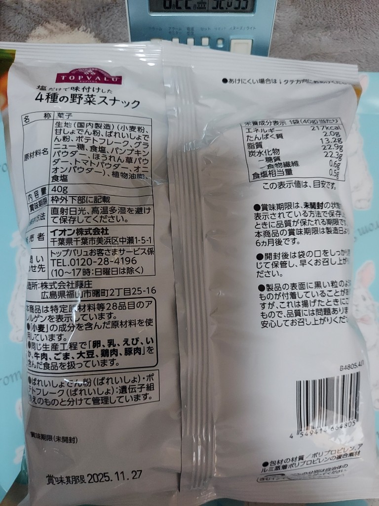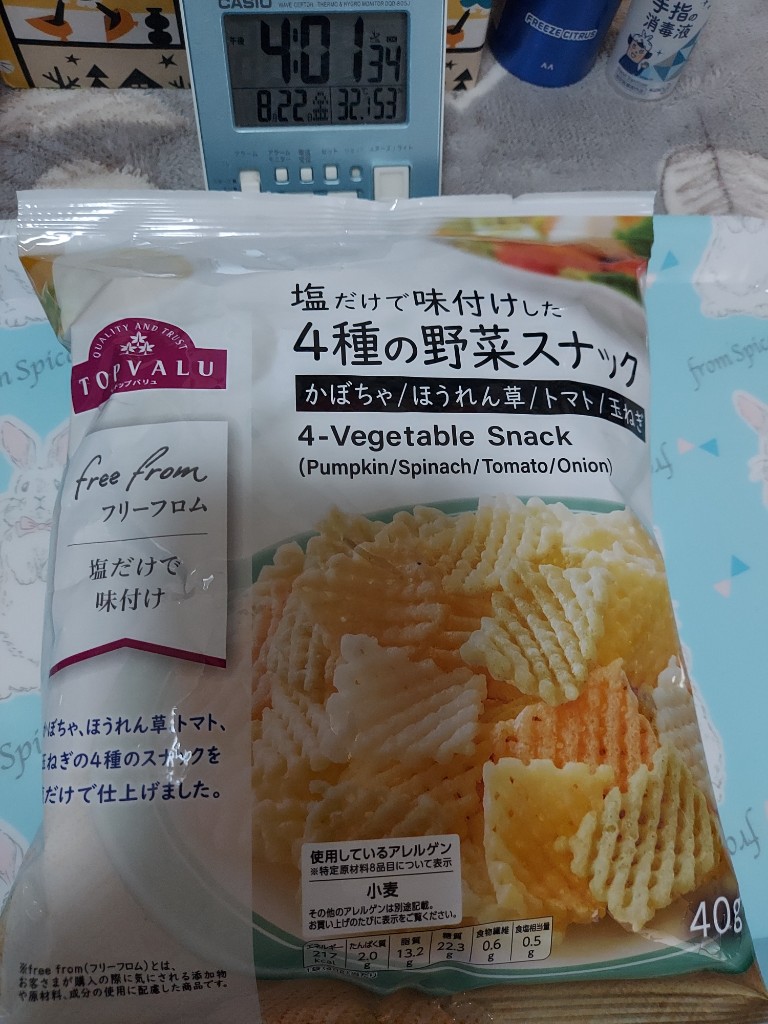 もぐナビホームへ > お菓子 > ポテトチップス・スナック > イオン トップバリュ フリーフロム 塩だけで味付けした4種の野菜スナック
