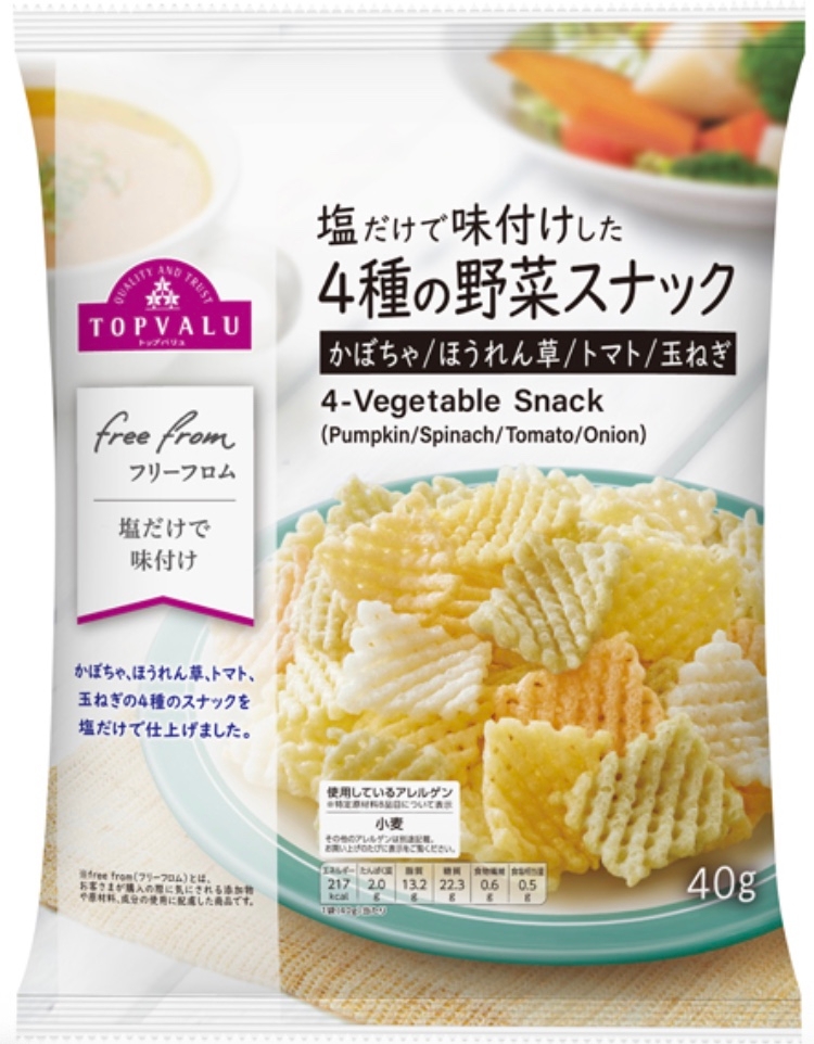 もぐナビホームへ > トップバリュ > イオン トップバリュ フリーフロム 塩だけで味付けした4種の野菜スナック