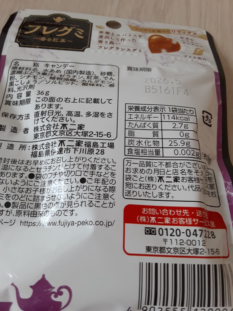 フレグミ香る紅茶 シナモンが気になり購入しました(o^-^o) 寝る前のおやつに冷やして頂きます❄️ 開封すると香水見たいな香り グミは、グニグニと噛み応えがあり、ちょっぴりジューシーで甘酸っぱい味わい... 続きを読む