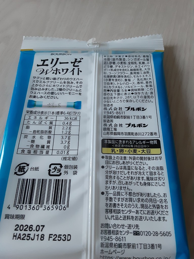 エリーゼ新作。ミルククリーム入りウエハースをホワイトクリームコーティング。サクサクウエハースとミルククリーム、ホワイトクリームがマッチして美味しかった。 #期間限定 #おやつ #ブルボンお菓子 #ウエハース #ミルク ... 続きを読む