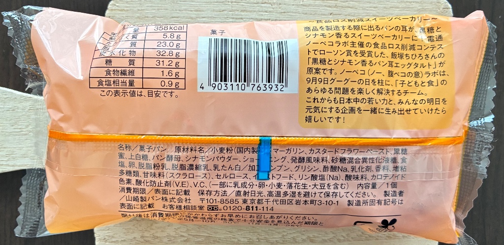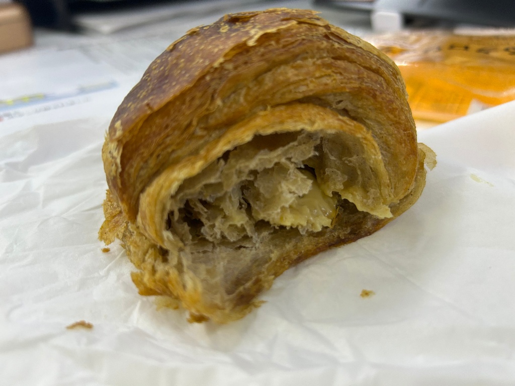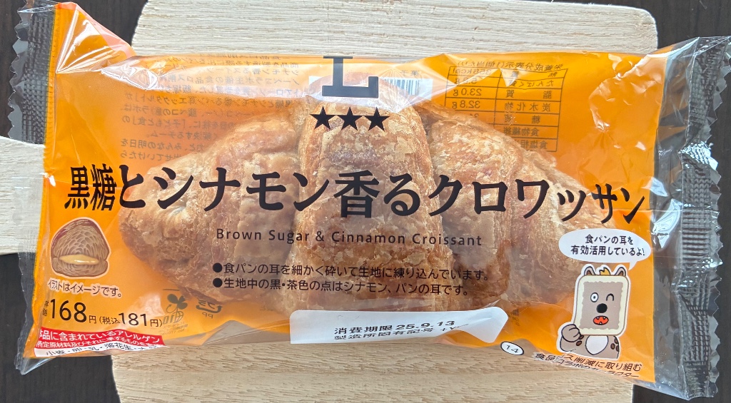 袋にはパンの耳とシナモンを混ぜ込んだクロワッサン生地に、黒蜜入りのカスタードクリームをサンドしました。との事。パンの耳を再利用したサスティナブルなクロワッサンのお味や食感はいかに?