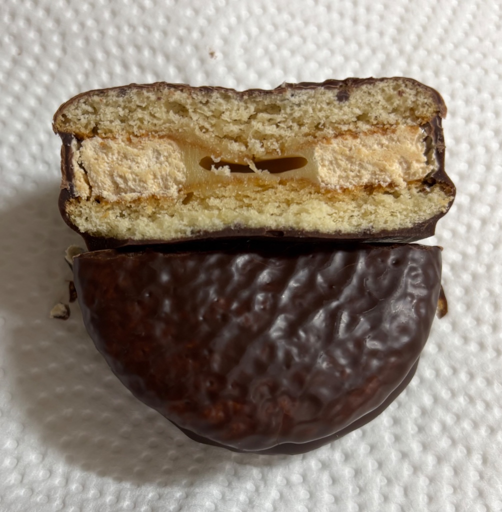 中のキャラメルとバターの香りが、通常のチョコパイよりも風味豊かにしていて美味しいです。