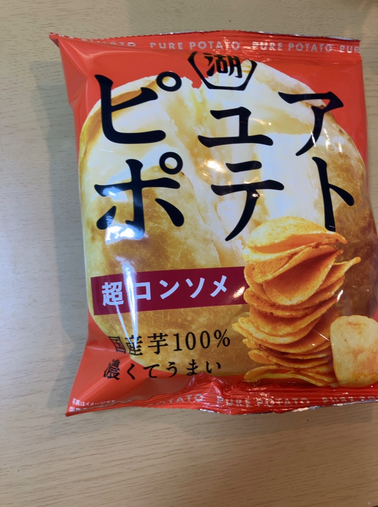 TAIGAで買った「湖池屋 ピュアポテト 超コンソメ 袋52g」。 程良く厚みがあり、コンソメの風味も、しっかり味付け濃いめの仕上がりです。 ついつい、食べたくなる美味しさです。 ごちそうさまでした!