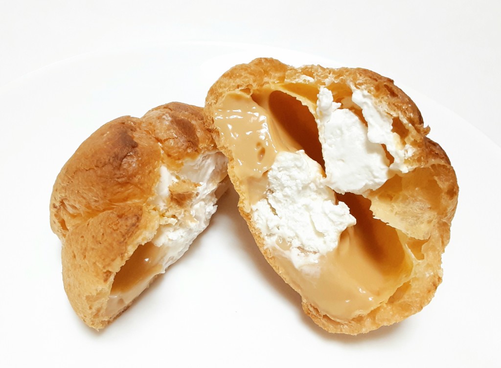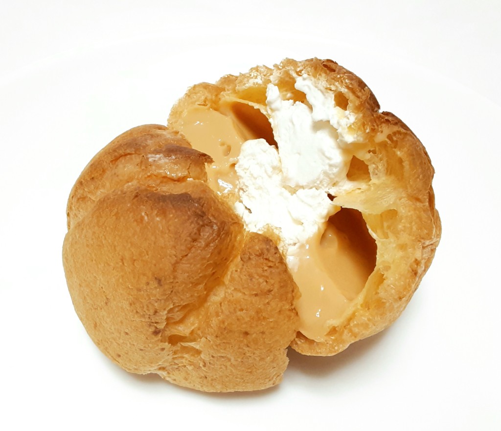 くしゅっと軽く柔らかなシュー生地にホイップクリームと生キャラメルカスタードクリームが入っています。