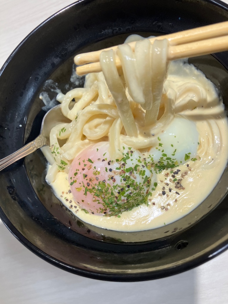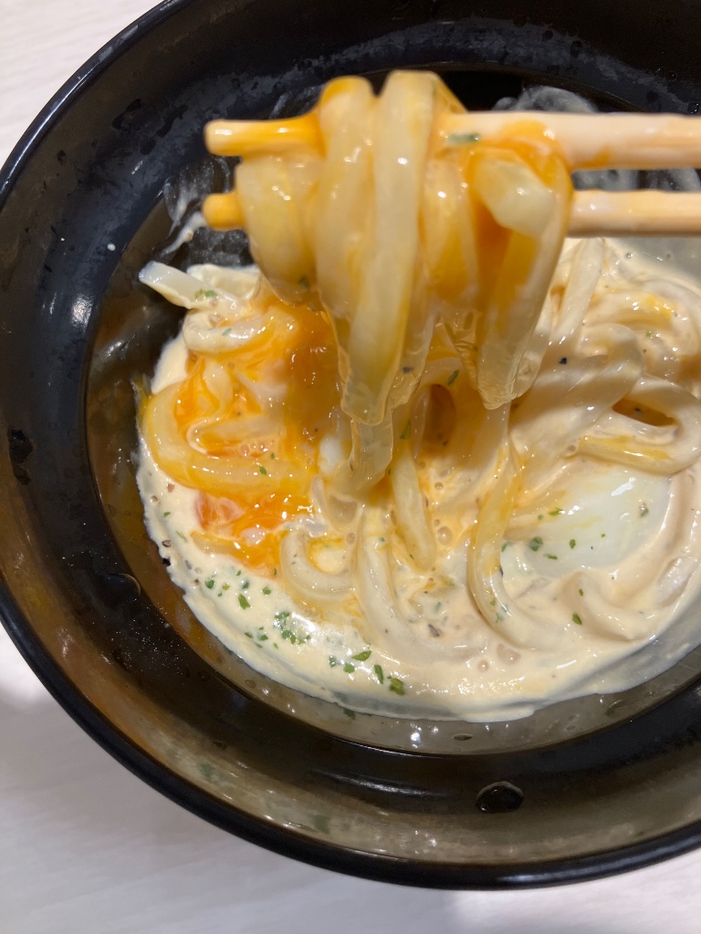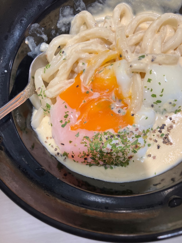 カルボうどん 390円(税込) 久しぶりの魚ベイベーε( ε ◜௰◝ )з いつも明太温玉うどん みたいなのを頼むのですが フェア商品なのかこんなの発見💡 カルボナーラとか 何十年振りだろうか... 届いたおうどんは熱々ほかほか よくある感じの冷凍うどんに カルボナーラソースと温玉 黒胡椒がかかっています💡 麺はおそらく半玉くらいかな? たまごは箸で割るととろ〜り 麺に絡めるととても美味しい カルボナーラ味でした …続きを読む